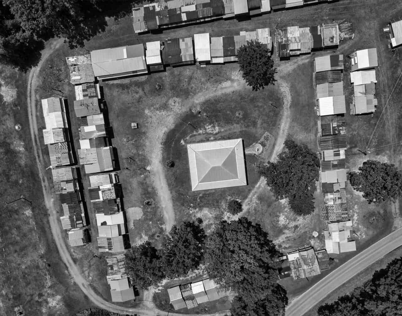 The aerial view is the historical representation of the evolution of tent construction around a central worship center - the Arbor. There are presently 102 "tents".