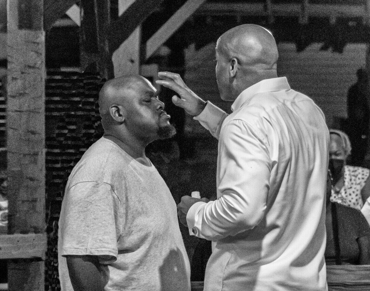 The call is a ritual in which the "sinner," accompanied by a trusted friend, comes forward to the altar to publicly confess their sins. The congregant praying in the background is a noteworthy gesture.